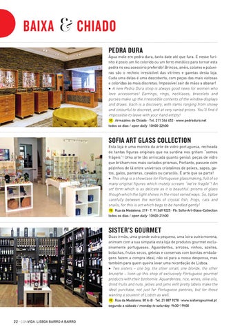 Duas irmãs, uma grande outra pequena, uma loira outra morena, animam com a sua simpatia esta loja de produtos gourmet exclusivamente portugueses. Aguardentes, arrozes, vinhos, azeites, bolachas, frutos secos, geleias e conservas com bonitas embalagens fazem a compra ideal, não só para a nossa despensa, mas também para quem queira levar uma recordação de Lisboa. 3 Two sisters – one big, the other small, one blonde, the other brunette – liven up this shop of exclusively Portuguese gourmet products with their bonhomie. Aguardentes, rice, wines, olive oils, dried fruits and nuts, jellies and jams with pretty labels make the ideal purchase, not just for Portuguese pantries, but for those wanting a souvenir of Lisbon as well. 9E Rua da Madalena, 80 A-B · Tel. 21 887 9278 · www.sistersgourmet.pt segunda a sábado / monday to saturday 9h30-19h00