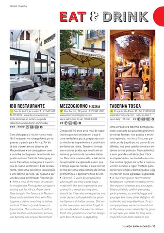 Com vista para o rio, torna-se mais fácil imaginar os navegadores portugueses a partir para África. Foi de lá que trouxeram os sabores de Moçambique e os conjugaram com a cozinha portuguesa, resultando em pratos como o Caril de Caranguejo ou os Camarões selvagens à Laurentina (o nosso preferido!). Este restaurante, com uma excelente localização e um óptimo serviço, vai passar a ser um dos seus preferidos! Reserve já! 3 With a view of the river, it’s easier to imagine the Portuguese navigators setting sail for Africa. From there they brought the flavours of Mozambique and combined then with Portuguese cuisine, resulting in dishes such as Crab curry and Prawns à Laurentina. This restaurant, with a great location and excellent service, will become one of your favourites!