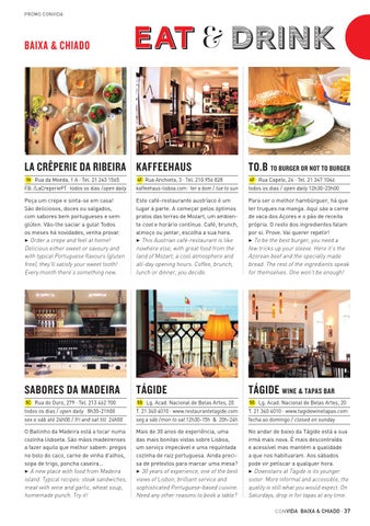 No andar de baixo da Tágide está a sua irmã mais nova. É mais descontraída e acessível mas mantém a qualidade a que nos habituaram. Aos sábados pode vir petiscar a qualquer hora. 3 Downstairs at Tágide is its younger sister. More informal and accessible, the quality is still what you would expect. On Saturdays, drop in for tapas at any time. CON VIDA BAIXA & CHIADO · 37