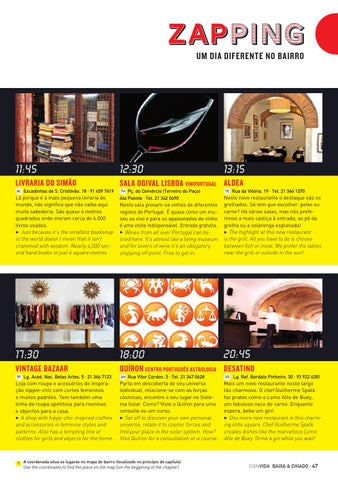 7E Rua da Vitória, 19 · Tel. 21 346 1370 Neste novo restaurante o destaque são os grelhados. Só tem que escolher: peixe ou carne? Há várias salas, mas nós preferimos a mais castiça à entrada, ao pé da grelha ou a solarenga esplanada! 3 The highlight at this new restaurant is the grill. All you have to do is choose between fish or meat. We prefer the tables near the grill or outside in the sun!