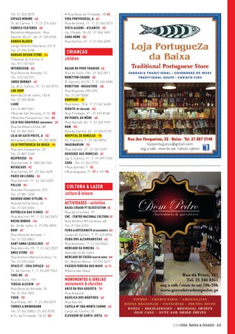 Tel. 21 322 5075 ESPAÇO MÍNIMO 4D Tv. do Carmo, 1 · T. 21 274 4261 FÁBRICA FEATURES 3E Benetton Megastore · Rua Garrett, 83-4º · Tel. 21 325 6765 GANDIA BLASCO Largo Vitorino Damásio, 2 F-G Tel. 21 396 2338 HANGAR DESIGN STORE 5A Travessa do Carmo, 8 Tel. 911 157 507 INTERDESIGN 6G Rua Nova do Almada, 13 Tel. 210 156 571 JORGE BURNAY 4F Lg. de S. Carlos, 15 · 21 347 8774 LAR SHOP Avenida 24 de Julho, 126 A Tel. 21 395 8338 LIANE Tel. 21 887 9261 • Rua de São Nicolau, 5-13 8E • Rua dos Fanqueiros, 146 8E LOJA DAS GRAVURAS (MOLDURAS) 2C Rua da Misericórdia, 88 Tel. 21 342 3261 LOJA DO GATO PRETO, A 5E Armazéns Chiado · 21 322 3050 LOJA PORTUGUEZA DA BAIXA 9G Rua dos Fanqueiros, 32 Tel. 21 887 3148 NESPRESSO 5E Rua Garrett, 8 · 800 260 260 NICKOLAUS 5C Rua Carmo, 87 · 21 346 3439 PARIS EM LISBOA 3E Rua Garrett, 77 · 21 342 4329 POLLUX 8C Rua dos Fanqueiros, 276 Tel. 21 881 1200 QUERIDO HOME STYLING 9i Rua da Horta Seca, 24 Tel. 21 324 3344 REPÚBLICA DAS FLORES 2F Rua Alecrim, 99 · T. 21 342 5073 ROCHE BOBOIS 10i Av. 24 de Julho, 3 · 21 396 0873 ROOF 6F Rua Nova do Almada, 1 Tel. 21 325 8847 SANT’ANNA (AZULEJOS) 2F Rua Alecrim, 95 · T. 21 342 2537 SMEG STORE 3G Rua António Maria Cardoso, 14 Tel. 21 470 4360 SPACE IT - CRIA ESPAÇO 4D Tv. do Carmo, 1 · T. 92 629 7247 TAKE.ME 6E Rua do Ouro, 151 TERESA ALECRIM 6F Rua Nova do Almada, 76 Tel. 21 342 1831 TIGER 7D Rua Prata, 181 · T. 21 396 0277 TORRES & BRINKMANN Tel. 21 342 5082 / 21 342 0735 • Tv. da Trindade, 18-22 3D