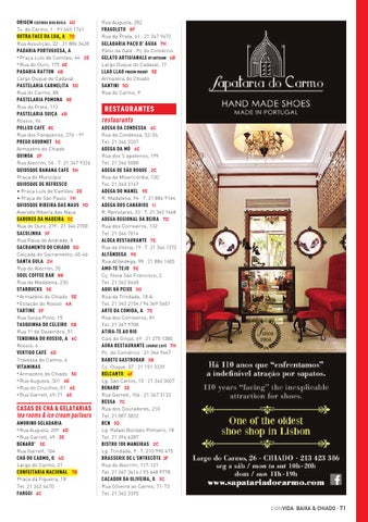 RESTAURANTES restaurants ADEGA DA CONDESSA 4C Rua da Condessa, 52-54 Tel. 21 346 3207 ADEGA DA MÓ 6C Rua dos S apateiros, 199 Tel. 21 346 5088 ADEGA DE SÃO ROQUE 2C Rua da Misericórdia, 120 Tel. 21 343 2167 ADEGA DO MANEL 9E R. Madalena, 94 · T. 21 886 9164 ADEGA DOS CANÁRIOS 1i R. Remolares, 23 · T. 21 342 1468 ADEGA REGIONAL DA BEIRA 7D Rua dos Correeiros, 132 Tel. 21 346 7014 ALDEA RESTAURANTE 7E Rua da Vitória, 19 · T. 21 346 1370 ALFÂNDEGA 9G Rua Alfândega, 98 · 21 886 1683 AMO-TE TEJO 5E Cç. Nova São Francisco, 2 Tel. 21 342 0668 AQUI HÁ PEIXE 3D Rua da Trindade, 18 A Tel. 21 343 2154 / 96 369 5601 ARTE DA COMIDA, A 7E Rua dos Correeiros, 81 Tel. 21 347 9708 ATIRA-TE AO RIO Cais do Ginjal, 69 · 21 275 1380 AURA RESTAURANTE LOUNGE CAFÉ 7H Pç. do Comércio · 21 346 9447 BABETE GASTROBAR 3B Cç. Duque, 57 · 21 151 3339 BELCANTO 4F Lg. São Carlos, 10 · 21 342 0607 BENARD’ 3E Rua Garrett, 104 · 21 347 3133 BESSA 7C Rua dos Douradores, 210 Tel. 21 887 3832 BCN 3D Lg. Rafael Bordalo Pinheiro, 18 Tel. 21 396 6287 BISTRO 100 MANEIRAS 2C Lg. Trindade, 9 · T. 210 990 475 BRASSERIE DE L’ENTRECÔTE 2F Rua do Alecrim, 117-121 Tel. 21 347 3616 / 93 648 9778 CAÇADOR DA OLIVEIRA, O 3C Rua Oliveira ao Carmo, 71-73 Tel. 21 342 3395 CON VIDA BAIXA & CHIADO · 71