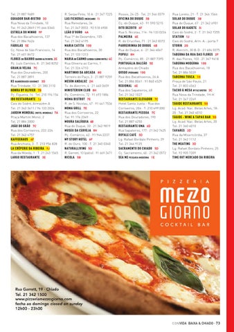 R. Serpa Pinto, 10 A · 21 347 7225 LAS FICHERAS (MEXICANO) 1i Rua Remolares, 34 Tel. 21 347 0553 · 92 518 4900 LEÃO D’OURO 4A Rua 1º de Dezembro, 105 Tel. 21 342 6195 MARIA CATITA 10G Rua dos Bacalhoeiros, 30 Tel. 21 133 1313 MARIA DO CARMO (LISBOA CARMO HOTEL) 4C Rua Oliveira ao Carmo, 1 Tel. 21 326 4710 MARTINHO DA ARCADA 8G Terreiro do Paço, 3 · 21 887 9259 MESÓN ANDALUZ 2H Tv. do Alecrim, 4 · 21 460 0659 MINISTERIUM CLUB 8H Pç. Comércio, 72 · 91 693 1884 MOMA BISTROT 7E R. de S. Nicolau, 47 · 91 441 7536 MOMA GRILL 7E Rua dos Correeiros, 22 Tel. 91 176 2349 MOURA SALÚQUIA 4B Rua do Duque, 33 · 21 342 9819 MUSEU DA CERVEJA 8H Pç. Comércio, 62 · 91 944 2237 MY STORY HOTEL 6F R. do Ouro, 100 · T. 21 340 0340 NATURALLIVING 5D R. Garrett, 10 (pátio) · 91 669 3471 NICOLA 5B