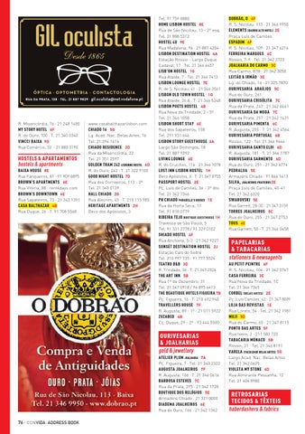 Tel. 91 759 8880 HOME LISBON HOSTEL 8E Rua de São Nicolau, 13 - 2º esq. Tel. 21 888 5312 HOSTEL 4U 9E Rua Madalena, 96 · 21 887 4204 LISBON DESTINATION HOSTEL 4A Estação Rossio - Largo Duque Cadaval, 17 · Tel. 21 346 6457 LISB’ON HOSTEL 1G Rua Ataíde, 7 · Tel. 21 346 7413 LISBON LOUNGE HOSTEL 7E R. de S. Nicolau, 41 · 21 346 2061 LISBON OLD TOWN HOSTEL 1G Rua Ataíde, 26 A · T. 21 346 5248 LISBON POETS HOSTEL 4B Rua Nova da Trindade, 2 - 5º Tel. 21 346 1058 LISBON SHORT STAY 6E Rua dos Sapateiros, 158 Tel. 211 931 646 LISBON STORY GUESTHOUSE 6A Largo São Domingos, 18 Tel. 21 887 9392 LIVING LOUNGE 6E R. do Crucifixo, 116 · 21 346 1078 LOST INN LISBON HOSTEL 1H Beco Apóstolos, 6 · T. 21 347 0755 PASSPORT HOSTEL 2E Pç. Luís de Camões, 36 - 2º dto. Tel. 21 342 7346 PH CHIADO PARADELLA’S HOUSES 1E Rua da Horta Seca, 11 Tel. 91 818 0779 RIBEIRA TEJO BOUTIQUE GUESTHOUSE 1H Travessa de São Paulo, 5 Tel. 91 331 2778 / 91 329 0102 SHIADO HOSTEL 4F Rua Anchieta, 5-3 · 21 342 9227 SUNSET DESTINATION HOSTEL 2J Estação Cais do Sodré Tel. 210 997 735 · 91 777 5524 TEATRO B&B 3D R. Trindade, 36 · T. 21 347 2024 THE ART INN 5B Rua 1º de Dezembro, 31 Tel. 21 347 0918 / 96 895 6413 THE BEAUTIQUE HOTELS FIGUEIRA 7B Pç. Figueira, 16 · T. 210 492 940 TRAVELLERS HOUSE 7F R. Augusta, 89 - 1º · 21 011 5922 ZUZABED 4B Cç. Duque, 29 - 2º · 93 444 5500