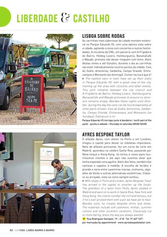 O alfaiate Ayres, com atelier no Porto e em Londres, chegou à capital para deixar os lisboetas impecáveis. Neto de alfaiate portuense, fez um curso de corte em Madrid, aprendeu na célebre Savile Row, passando por Nova Iorque e Hong Kong. Já cortou e coseu para ilustríssimos clientes e até aqui não ouvimos dizer que tenha espetado uma agulha. Além dos fatos, também faz camisas e sapatos à medida. A escolha de tecidos é grande e varia entre caxemiras macias, mohaires, algodões de Verão e outras alternativas excêntricas. Clássico ou arrojado, vista-se como sempre sonhou. 3 With shops in Porto and London, Ayres Bespoke Tailor has arrived in the capital to smarten up the locals. The grandson of a tailor from Porto, Ayres studied in Madrid and went on to work in Savile Row, New York and Hong Kong. His clients number the rich and famous, but if he’s ever pricked them with a pin we have yet to hear. Besides suits, he creates bespoke shirts and shoes. The materials include soft cashmere, mohair, summer cottons and other eccentric variations. Classically cut or more daring, dress the way you always wanted. 5F Rua Rodrigues Sampaio, 19 - 4º B · Tel. 91 447 1671 por marcação/by appointment) · www.ayresbespoketailor.com