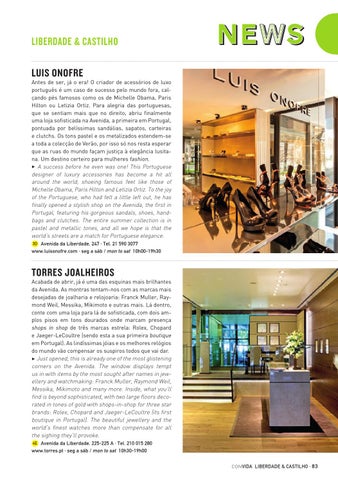 Antes de ser, já o era! O criador de acessórios de luxo português é um caso de sucesso pelo mundo fora, calçando pés famosos como os de Michelle Obama, Paris Hilton ou Letizia Ortiz. Para alegria das portuguesas, que se sentiam mais que no direito, abriu finalmente uma loja sofisticada na Avenida, a primeira em Portugal, pontuada por belíssimas sandálias, sapatos, carteiras e clutchs. Os tons pastel e os metalizados estendem-se a toda a colecção de Verão, por isso só nos resta esperar que as ruas do mundo façam justiça à elegância lusitana. Um destino certeiro para mulheres fashion. 3 A success before he even was one! This Portuguese designer of luxury accessories has become a hit all around the world, shoeing famous feet like those of Michelle Obama, Paris Hilton and Letizia Ortiz. To the joy of the Portuguese, who had felt a little left out, he has finally opened a stylish shop on the Avenida, the first in Portugal, featuring his gorgeous sandals, shoes, handbags and clutches. The entire summer collection is in pastel and metallic tones, and all we hope is that the world’s streets are a match for Portuguese elegance. 3D Avenida da Liberdade, 247 · Tel. 21 590 3077 www.luisonofre.com · seg a sáb / mon to sat 10h00-19h30