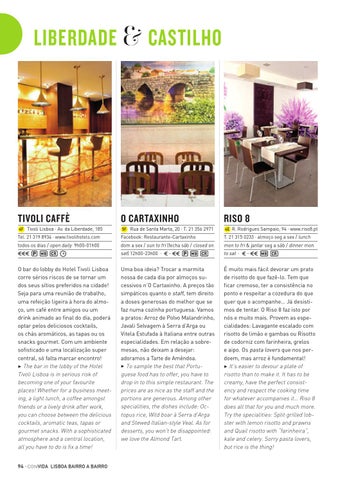 O bar do lobby do Hotel Tivoli Lisboa corre sérios riscos de se tornar um dos seus sítios preferidos na cidade! Seja para uma reunião de trabalho, uma refeição ligeira à hora do almoço, um café entre amigos ou um drink animado ao final do dia, poderá optar pelos deliciosos cocktails, os chás aromáticos, as tapas ou os snacks gourmet. Com um ambiente sofisticado e uma localização super central, só falta marcar encontro! 3 The bar in the lobby of the Hotel Tivoli Lisboa is in serious risk of becoming one of your favourite places! Whether for a business meeting, a light lunch, a coffee amongst friends or a lively drink after work, you can choose between the delicious cocktails, aromatic teas, tapas or gourmet snacks. With a sophisticated atmosphere and a central location, all you have to do is fix a time! 94 · CON VIDA LISBOA BAIRRO A BAIRRO