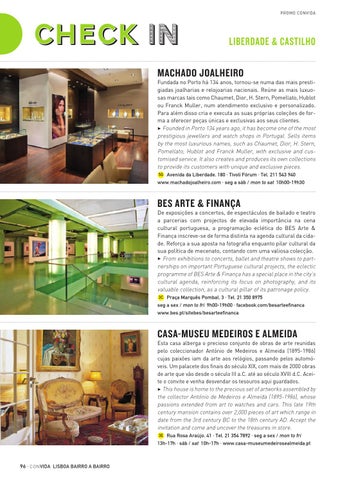 Fundada no Porto há 134 anos, tornou-se numa das mais prestigiadas joalharias e relojoarias nacionais. Reúne as mais luxuosas marcas tais como Chaumet, Dior, H. Stern, Pomellato, Hublot ou Franck Muller, num atendimento exclusivo e personalizado. Para além disso cria e executa as suas próprias coleções de forma a oferecer peças únicas e exclusivas aos seus clientes. 3 Founded in Porto 134 years ago, it has become one of the most prestigious jewellers and watch shops in Portugal. Sells items by the most luxurious names, such as Chaumet, Dior, H. Stern, Pomellato, Hublot and Franck Muller, with exclusive and customised service. It also creates and produces its own collections to provide its customers with unique and exclusive pieces. 5G Avenida da Liberdade, 180 · Tivoli Fórum · Tel. 211 543 940 www.machadojoalheiro.com · seg a sáb / mon to sat 10h00-19h30