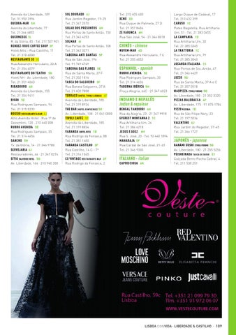 SOL DOURADO 6J Rua Jardim Regedor, 19-25 Tel. 21 347 2570 SOLAR DOS PRESUNTOS 6H Rua Portas de Santo Antão, 150 Tel. 21 342 4253 SOLMAR 6I Rua Portas de Santo Antão, 108 Tel. 21 342 3371 TABERNA ANTI DANTAS 5F Rua de São José, 196 Tel. 91 749 4749 TABERNA DAS FLORES 5E Rua de Santa Marta, 27 F Tel. 21 352 1816 TASCA DO SALGUEIRO 3F Rua Barata Salgueiro, 37 A Tel. 21 602 7858 TERRAÇO (HOTEL TIVOLI LISBOA) 4F Avenida da Liberdade, 185 Tel. 21 319 8934 THE BAR (HOTEL FONTECRUZ) 5G Av. Liberdade, 138 · 21 041 0000 TIVOLI CAFFÈ 5F Avenida da Liberdade, 185 Tel. 21 319 8834 VARANDA (HOTEL RITZ) 1B Rua Rodrigo da Fonseca, 88 Tel. 21 381 1400 VARANDA CASTILHO 3F Rua Castilho, 14 C - 7º Tel. 21 314 1045 CS VINTAGE RESTAURANTE BAR 2F Rua Rodrigo da Fonseca, 2