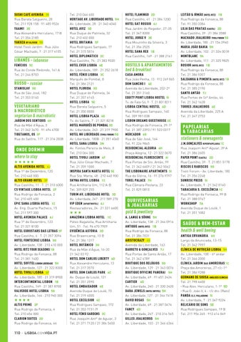 AMAZÓNIA LISBOA HOTEL 1C Páteo Bagatella, Rua Artilharia Um, 51 · Tel. 96 670 7909 EVIDÊNCIA ASTÓRIA 3D Rua Braamcamp, 10 B Tel. 21 386 1317 HOTEL BOTÂNICO 3H Rua da Mãe d’Água, 16-20 21 342 03 92 HOTEL DOM CARLOS LIBERTY 4D Rua Alexandre Herculano, 13 Tel. 21 317 3570 HOTEL DOM CARLOS PARK 4C Av. Duque de Loulé, 121 Tel. 21 351 2590 HOTEL EMBAIXADOR 6E Avenida Duque de Loulé, 73 Tel. 21 319 4000 HOTEL EXCELSIOR 4C Rua Rodrigues Sampaio, 172 Tel. 21 353 7151 /9 HOTEL FÉNIX GARDENS 3C Rua Joaquim Antº de Aguiar, 3 Tel. 21 371 7120 / 21 384 5650