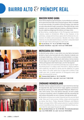 Nuno Gama dispensa apresentações, é uma referência confirmada no panorama da moda masculina portuguesa. Mas a novidade é a sua nova morada, um grande e luminoso espaço, que valoriza as suas colecções de roupa e acessórios. Para além de loja, conta também com um espaço dedicado à beleza: a Barbearia decorada com cadeiras antigas que lhe oferece um toque retro. 3 Nuno Gama, a leading figure in the Portuguese male fashion industry, needs no introduction. What is new, however, is his premises, a large and luminous space which enhances his collections of clothes and accessories. Besides the shop, it also features an area dedicated to beauty: a barber’s shop decorated with old-style chairs which give it a retro touch. 6D Rua do Século, 171 · Tel. 21 347 9068 / 93 466 1082 Facebook: GamaNuno · seg a sáb / mon to sat 10h00-20h00
