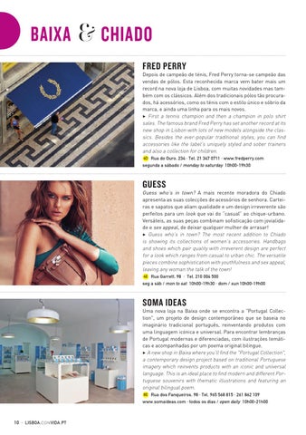 Depois de campeão de ténis, Fred Perry torna-se campeão das vendas de pólos. Esta reconhecida marca vem bater mais um record na nova loja de Lisboa, com muitas novidades mas também com os clássicos. Além dos tradicionais pólos tão procurados, há acessórios, como os ténis com o estilo único e sóbrio da marca, e ainda uma linha para os mais novos. 3 First a tennis champion and then a champion in polo shirt sales. The famous brand Fred Perry has set another record at its new shop in Lisbon with lots of new models alongside the classics. Besides the ever-popular traditional styles, you can find accessories like the label’s uniquely styled and sober trainers and also a collection for children. 6D Rua do Ouro, 234 · Tel. 21 347 0711 · www.fredperry.com segunda a sábado / monday to saturday 10h00-19h30