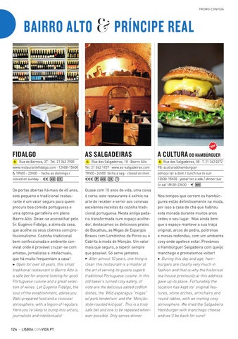 De portas abertas há mais de 40 anos, este pequeno e tradicional restaurante é um valor seguro para quem procura boa comida portuguesa e uma óptima garrafeira em pleno Bairro Alto. Deixe-se aconselhar pelo Sr. Eugénio Fidalgo, a alma da casa, que acolhe os seus clientes com profissionalismo. Cozinha tradicional bem confeccionada e ambiente convivial onde é provável cruzar-se com artistas, jornalistas e intelectuais, que há muito frequentam a casa! 3 Open for over 40 years, this small traditional restaurant in Bairro Alto is a safe bet for anyone looking for good Portuguese cuisine and a great selection of wines. Let Eugénio Fidalgo, the soul of the establishment, advise you. Well-prepared food and a convivial atmosphere, with a legion of regulars. Here you’re likely to bump into artists, journalists and intellectuals! 124 · LISBOA.CON VIDA.PT