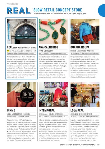 Pioneira no Príncipe Real, esta vibrante loja oferece uma experiência única, com uma mistura inovadora de marcas reunidas no mesmo espaço. Ideal para fazer compras ou para uma pausa de almoço. 3 A pioneer in Príncipe Real, this vibrant shop provides a unique experience, with an innovative mixture of labels under the same roof. Ideal for shopping or for taking a break for lunch.