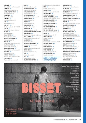 PARK 5i Calçada do Combro, 58 PÁTIO DAS CANTIGAS 2H Rua Correia Garção, 3 PAVILHÃO CHINÊS 7D Rua Dom Pedro V, 89-91 POP OUT BAR GALERIA 7J Rua da Bica Duarte Belo, 31 PORTAS LARGAS 8G Rua da Atalaia, 105 PRIMAS 8F Rua da Atalaia, 154 PUB LISBOETA 7D Rua Dom Pedro V, 63 PUREX CLUBE 8I Rua das Salgadeiras, 28 QUIOSQUE MIRADOURO SÃO PEDRO DE ALCÂNTRA 9D Miradouro S. Pedro de Alcântara ROCK & NUBBE 9H Rua do Diário de Notícias, 34 SALTO ALTO 7F Rua da Rosa, 157 SÁTIROS / CLÁSSICO BAR 6C Calçada da Patriarcal, 6 SEM NOM 8F Rua do Diário de Notícias, 132 SÉTIMO CÉU 8H Travessa da Espera, 54 SIDE 8H Rua da Barroca, 33 SOFT 9H Rua do Norte, 47-49 SOLAR DO VINHO DO PORTO 9E