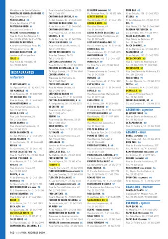 RESTAURANTES restaurants 13 RESTAURANTE 8i Tv. Água da Flor, 13 · 92 405 1272 100 MANEIRAS 8E R. do Teixeira, 35 · 91 030 7575 151 ONE FIVE ONE 7G Rua da Rosa, 151 · 91 643 8420 ADAMASTORZINHO 6I Rua Marechal Saldanha, 24 Tel. 21 347 1726 ADEGA D. LUÍS 4C Rua Luís Fernandes, 24 Tel. 21 346 3368 ADEGA DANTAS 6I Rua Marechal Saldanha, 15 Tel. 21 342 0329 ADEGA DAS MERCÊS 8I Tv. das Mercês, 2 · 21 342 4492 ADEGA TAGARRO 7I R. Luz Soriano, 21 · 21 346 4620 ALFAIA 9G Tv. Queimada, 22 · 21 346 1232 ANTIGA CASA FAZ FRIO 7C Rua D. Pedro V, 96 · 21 346 1860 ANTIGO 1º DE MAIO 8I R. da Atalaia, 8 · T. 21 342 6840 APICIUS 3H Rua Cruz dos Poiais, 89 Tel. 21 390 0652 BAIUCA, A 8H R. da Barroca, 86 · 21 342 1386 BARRIGAS 8G Tv. Queimada, 31 · 21 347 1220 BEEF BURGER BAR BY EL GORDO 7E R. S. Boaventura, 16 · 21 342 4266 BISTRO EDELWEISS 3G Rua S. Marçal, 2 · 21 346 5324 BLEND 9I R. do Norte, 24 · T. 21 347 1383 BOTA ALTA 8G Tv. Queimada, 35 · 21 342 7959 CAFÉ DE SÃO BENTO 2G R. S. Bento, 212 · 21 395 2911 CALDO VERDE 8G Tv. Poço Cidade, 40 · 21 342 2091 CAMPONESA STA. CATARINA, A 6I