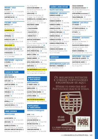 PAPELARIAS & TABACARIAS stationers & newsagents LOJA! 3-4G Rua Eduardo Coelho , 80 Tel. 21 342 3423 LOJA DAS REVISTAS 8I R. do Loreto, 54 · T. 21 342 1981 OFICINA COLECTIVA 4i Rua do Poço dos Negros, 58 Tel. 21 820 8403 TABACARIA MARTINS 7I Lg. do Calhariz, 4 · 21 346 4789 CON VIDA BAIRRO ALTO & PRÍNCIPE REAL ·