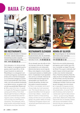 Com vista para o rio, torna-se mais fácil imaginar os navegadores portugueses a partir para África. Foi de lá que trouxeram os sabores de Moçambique e os conjugaram com a cozinha portuguesa, resultando em pratos como o Caril de Caranguejo ou os Camarões selvagens à Laurentina (o nosso preferido!). Este restaurante, com uma excelente localização e um óptimo serviço, vai passar a ser um dos seus preferidos! Reserve já! 3 With a view of the river, it’s easier to imagine the Portuguese navigators setting sail for Africa. From there they brought the flavours of Mozambique and combined then with Portuguese cuisine, resulting in dishes such as Crab curry and Prawns à Laurentina. This restaurant, with a great location and excellent service, will become one of your favourites! 20 · LISBOA.CON VIDA.PT