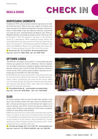 "Be different, be unique, be yourself!", é o lema desta loja para homens que gostam de marcar a diferença. Sinta-se especial com as roupas, acessórios e calçado arrojados e alternativos das diversas marcas como Scotch & Soda, ES Collection, Ganesh e muitas outras. Entre, avance pelas arcadas e descubra as surpresas que se escondem em cada uma delas. 3 "Be different, be unique, be yourself!" is the motto of this shop for men who like to stand out from the rest. The bold and alternative clothes, accessories and shoes by the various labels such as Scotch & Soda, ES Collection, Ganesh and many others will make you feel special. Enter, walk under the arcades and discover the surprises that await. 2C Rua da Misericórdia, 68 · www.facebook.com/uptownlisboa seg a sáb / mon to sat 10h30-20h00 · dom / sun 14h30-20h00