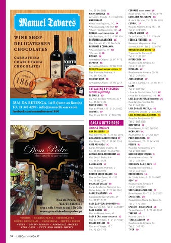 CORBALIS (CASAS BANHO) 2F Rua Flores, 107 · T. 21 342 6978 CUTELARIA POLYCARPO 8E R. de S. Nicolau, 25 · 21 886 6205 CUTIPOL 2F Rua do Alecrim, 84 & 113-115 Tel. 21 322 5075 ESPAÇO MÍNIMO 4D Tv. do Carmo, 1 · T. 21 274 4261 FÁBRICA FEATURES 3E Benetton Megastore · Rua Garrett, 83-4º · Tel. 21 325 6765 HANGAR DESIGN STORE 5A Travessa do Carmo, 8 Tel. 911 157 507 INTERDESIGN 6G Rua Nova do Almada, 13 Tel. 210 156 571 INTUKASA 6F Rua Nova do Almada, 30-34 Tel. 21 347 0176 JORGE BURNAY 4F Lg. de S. Carlos, 15 · 21 347 8774 LIANE Tel. 21 887 9261 • Rua de São Nicolau, 5-13 8E • Rua dos Fanqueiros, 146 8E LOJA DAS GRAVURAS (MOLDURAS) 2C Rua da Misericórdia, 88 Tel. 21 342 3261 LOJA DO GATO PRETO, A 5E Armazéns Chiado · 21 322 3050 LOJA PORTUGUEZA DA BAIXA 9G Rua dos Fanqueiros, 32 Tel. 21 887 3148 NESPRESSO 5E Rua Garrett, 8 · 800 260 260 NICKOLAUS 5C Rua Carmo, 87 · 21 346 3439 PARIS EM LISBOA 3E Rua Garrett, 77 · 21 342 4329 POLLUX 8C Rua dos Fanqueiros, 276 Tel. 21 881 1200 QUERIDO HOME STYLING 9i Rua da Horta Seca, 24 Tel. 21 324 3344 REPÚBLICA DAS FLORES 2D Rua da Misericórdia, 31 Tel. 21 342 5073 ROCHE BOBOIS 10i Av. 24 de Julho, 3 · 21 396 0873 ROOF 6F Rua Nova do Almada, 1 Tel. 21 325 8847 SANT’ANNA (AZULEJOS) 2F Rua Alecrim, 95 · T. 21 342 2537 SMEG STORE 3G Rua António Maria Cardoso, 14 Tel. 21 470 4360 SPACE IT - CRIA ESPAÇO 4D Tv. do Carmo, 1 · T. 92 629 7247 TAKE.ME 6E Rua do Ouro, 151 TERESA ALECRIM 6F Rua Nova do Almada, 76 Tel. 21 342 1831 TIGER 7D