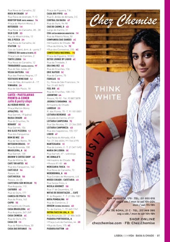 Praça da Figueira, 7 A CASA DOS PIPIS 6A Rua D. Antão de Almada, 3 C CENTRAL DA BAIXA 6F Rua do Ouro, 94-98 CHÁ DO CARMO, O 4D Largo do Carmo, 21 COA CAFÉ DA ORDEM DOS ARQUITECTOS 1H Rua da Ribeira Nova, 50 COMPANHIA DAS SANDES 6C • Armazéns do Chiado 5E • Rua da Vitória, 54 7E • Rua dos Correeiros, 235 6C CONFEITARIA NACIONAL 7B Praça da Figueira, 18 B/C DETOX LOUNGE BY LIQUID 4C Rua da Trindade, 1 ERA UMA VEZ 6E Rua do Crucifixo, 136 ERIC KAYSER 5C Rua do Carmo, 70 FÁBULAS 5E Cç. Nova de São Francisco, 14 Tel. 21 601 8472 FEEL RIO 6E Rua do Crucifixo, 108-110 JERONYMO 6A Rossio, 90-92 · Tel. 93 887 5878 JOSHUA’S SHOARMA 5E Armazéns do Chiado LANDEAU 2G R. das Flores, 70 · T. 91 181 0801 LEITARIA BEIRENSE 4B Calçada do Carmo, 49-51 LEITARIA CAMPESINA 7E Rua São Nicolau, 51 · 21 346 2005 LEITARIA CAMPONEZA 6D Rua dos Sapateiros, 155-157 LIQUID 6F Rua Nova do Almada, 45 A Tel. 21 346 6034 / 91 764 6195 MANTEIGARIA 1E Rua do Loreto, 2 · T. 21 347 1492 MARIA EM LISBOA 3E Rua Garrett, 47 - sobreloja MC DONALD’S • Armazéns do Chiado 5E • Rossio 81-83 6A MERCEARIA TOSCA 1H Rua Nova do Carvalho, 72 MERENDINHA, A 8B Rua Condes de Monsanto, 4 A MUSEU CHIADO - CAFETARIA 4G Rua Serpa Pinto, 4 NICOLA GOURMET 5B Rua 1º de Dezembro, 12 NOTAS DE DEGUSTAÇÃO ... CAFÉ R. do Regedor, 7 · T. 21 886 1081 NOVA POMBALINA 9F Rua do Comércio, 2 ORIGEM COZINHA BIOLÓGICA 4D Tv. do Carmo, 1 · 91 645 1741 OUTRA FACE DA LUA, A 7D Rua Assunção, 22 · 21 886 3430 PADARIA PORTUGUESA, A • Praça Luís de Camões, 44 2E • Rua do Ouro, 175 6E PADARIA RATTON 4B LISBOA CON VIDA · BAIXA & CHIADO · 61