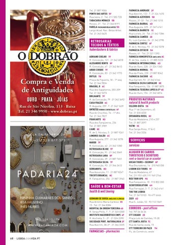 SAÚDE & BEM-ESTAR health & well beeing GERMANO DE SOUSA ANÁLISES CLÍNICAS Rua António Maria Cardoso 3G 15 · Tel. 21 346 8384 HOSPITAL DA ORDEM TERCEIRA 4G R. Serpa Pinto, 7 · T. 21 323 0300 INSTITUTO MACROBIÓTICO (IMP) 4F R. Anchieta, 5 - 2º · 21 324 2290 SOCIEDADE PORT. NATURALOGIA 2F Rua Alecrim, 38-3º · 21 346 3335