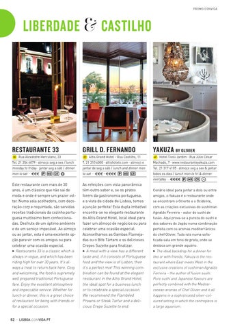 Este restaurante com mais de 30 anos, é um clássico que não sai de moda e onde é sempre um prazer voltar. Numa sala acolhedora, com decoração cozy e requintada, são servidas receitas tradicionais da cozinha portuguesa muitíssimo bem confeccionadas. Desfrute de um óptimo ambiente e de um serviço impecável. Ao almoço ou ao jantar, esta é uma excelente opção para vir com os amigos ou para celebrar uma ocasião especial. 3 Restaurante 33 is a classic which is always in vogue, and which has been riding high for over 30 years. It’s always a treat to return back here. Cosy and welcoming, the food is supremely well prepared traditional Portuguese fare. Enjoy the excellent atmosphere and impeccable service. Whether for lunch or dinner, this is a great choice of restaurant for being with friends or for a special occasion.