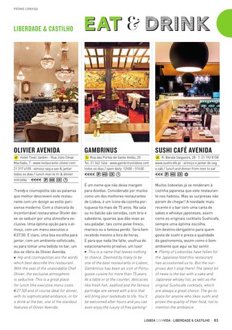 Trendy e cosmopolita são as palavras que melhor descrevem este restaurante com um design ao estilo parisiense moderno. Com a chancela do incontornável restaurateur Olivier deixe-se seduzir por uma atmosfera exclusiva. Uma óptima opção para o almoço, com um menu executivo a E27,50. E claro, uma boa escolha para jantar, com um ambiente sofisticado, ou para tomar uma bebida no bar, um dos ex-líbris do Olivier Avenida. 3 Hip and cosmopolitan are the words which best describe this restaurant. With the seal of the unavoidable Chef Olivier, the exclusive atmosphere is seductive. This is a great place for lunch (the executive menu costs E27.50) and of course ideal for dinner, with its sophisticated ambiance, or for a drink at the bar, one of the standout features of Olivier Avenida.