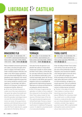 Nesta verdadeira brasserie parisiense em Lisboa, uma das principais atracções é o espaço reservado à ostras onde o écailler prepara refeições com sabor a mar. Num espaço grandioso com uma decoração elegante, nem os paladares mais exigentes irão resistir. Uma verdadeira experiência gourmet, com menus temáticos a preços muito especiais. E ao domingo, não falhe o Brunch à la française, uma óptima alternativa em família. Allons-y? 3 At this real Parisian brasserie in Lisbon one of the main attractions is the oyster bar where the écailler prepares meals with a taste of the sea. Amid the grandeur and elegant decor, not even the most demanding customer can resist. A true gourmet experience, with themed menus at very special prices. And on Sunday don’t miss the French-style brunch, a great alternative for the family. Allons-y? 84 · LISBOA.CON VIDA.PT