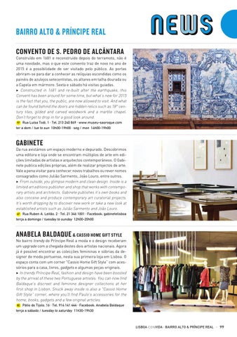No bairro trendy do Príncipe Real a moda e o design receberam um upgrade com a chegada destes dois artistas nacionais. Agora já é possível encontrar as colecções femininas e sóbrias da designer de moda portuense, nesta sua primeira loja em Lisboa. O espaço conta com um corner "Cassio Home Gift Style” com acessórios para a casa, livros, gadgets e algumas peças originais. 3 In trendy Príncipe Real, fashion and design have been boosted by the arrival of these two Portuguese artistes. You can now find Baldaque’s discreet and feminine designer collections at her first shop in Lisbon. Snuck away inside is also a "Cassio Home Gift Style” corner, where you’ll find Paulo’s accessories for the home, books, gadgets and a few original articles. 8E Pátio do Tijolo, 16 · Tel. 914 141 444 · Facebook: Anabela Baldaque terça a sábado / tuesday to saturday 11h30-19h30