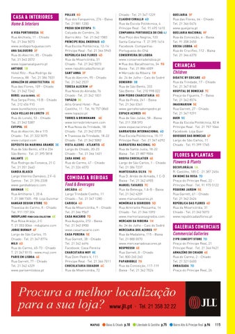 POLLUX 8D Rua dos Fanqueiros, 276 - Baixa Tel. 21 881 1200 PREGO SEM ESTOPA 7i Calçada do Combro, 36 Bairro Alto · Tel. 21 342 1583 PRÍNCIPE REAL ENXOVAIS 6D Rua Escola Politécnica, 12-14 Príncipe Real · Tel. 21 346 5945 REPÚBLICA DAS FLORES 4D Rua da Misericórdia, 31 Chiado · Tel. 21 342 5073 www.republicadasflores.pt SANT’ANNA 3F Rua do Alecrim, 95 - Chiado Tel. 21 342 2537 TERESA ALECRIM 6F Rua Nova do Almada, 76 Chiado · Tel. 21 342 1831 TOPÁZIO 3E Altis Grand Hotel - Rua Castilho, 11 · Tel. 96 757 0860 www.topazio.pt TORRES & BRINKMANN 4E www.torresbrinkmann.com • Rua Nova da Trindade, 1B Chiado · Tel. 21 342 0735 • Travessa da Trindade, 18-22 Chiado · Tel. 21 342 5082 VISTA ALEGRE - ATLANTIS 4E Largo do Chiado, 20-23 Chiado - Tel. 21 346 1401 ZARA HOME 6D Rua do Carmo, 47 - Chiado Tel. 21 326 4070