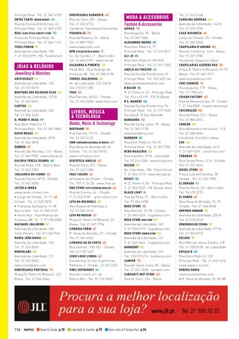 JÓIAS & RELÓGIOS Jewellery & Watches ARISTOCRAZY 5F Avenida da Liberdade, 163 Tel. 21 315 0372 BOUTIQUE DOS RELÓGIOS PLUS 5G Avenida da Liberdade, 129 B Tel. 21 343 0076 CARTIER 4D Avenida da Liberdade, 240 Tel. 21 330 2420 D. PEDRO V JÓIAS 9F Rua Dom Pedro V, 11 Príncipe Real · Tel. 21 343 3845 DAVID ROSAS 6H Avenida da Liberdade, 69 A Tel. 21 324 3870 DOBRÃO 6F Rua de São Nicolau, 113 - Baixa Tel. 21 346 9950 · www.dobrao.pt GALERIA TEREZA SEABRA 8G Rua da Rosa, 158 - Bairro Alto Tel. 21 342 5383 JOALHARIA DO CARMO 6D Rua do Carmo, 87 B - Chiado Tel. 21 342 3050 LEITÃO & IRMÃO www.leitao-irmao.com • Largo do Chiado, 16-17 4E Chiado · Tel. 21 325 7870 • Travessa da Espera, 14 9i Bairro Alto · Tel. 21 342 4107 • Hotel Ritz - Rua Rodrigo da Fonseca, 88 1B · T. 91 350 3384 MACHADO JOALHEIRO 5F Avenida da Liberdade, 180 Tivoli Fórum · Tel. 211 543 940 MARIA JOÃO BAHIA 6G Avenida da Liberdade, 102 Tel. 21 324 0018 MONTBLANC 5G Avenida da Liberdade, 111 Tel. 21 325 9825 www.montblanc.com OURIVESARIA PORTUGAL 7C Praça D. Pedro IV (Rossio), 122 Baixa · Tel. 21 346 9446