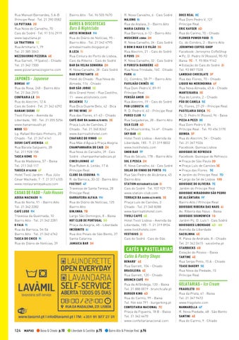 R. Nova Carvalho, 6 · Cais Sodré MAJONG 8i Rua da Atalaia, 3 - Bairro Alto MARIA CAXUXA 9i Rua Barroca, 6-12 - Bairro Alto MUSICBOX LISBOA 2H R. Nova Carvalho, 24 · Cais Sodré O BOM O MAU E O VILÃO 3G Rua Alecrim, 21 - Cais do Sodré O POVO 2H R. Nova Carvalho, 32 · Cais Sodré O PURISTA BARBIÉRE 4D Rua Nova Trindade, 16C · Chiado PARK 6i Cç. Combro, 58-7º - Bairro Alto PAVILHÃO CHINÊS 8E Rua Dom Pedro V, 89-91 Príncipe Real PENSÃO AMOR 3H Rua Alecrim, 19 - Cais do Sodré PUB LISBOETA 8E R. D. Pedro V, 63 - Príncipe Real PUREX CLUB 9J Rua Salgadeiras, 28 - Bairro Alto SILK CLUB 4D Rua Misericórdia, 14-6º · Chiado SKY BAR 4E Hotel Tivoli Lisboa - Avenida da Liberdade, 185 · T. 21 319 8832 www.tivolihotels.com SNOB BAR 7F Rua do Século, 178 - Bairro Alto SOL E PESCA 2H R. Nova Carvalho, 44 · Cais Sodré SOLAR DO VINHO DO PORTO 9G Rua São Pedro de Alcântara, 45 Bairro Alto STATION RESTAURANTE & CLUB 2i Cais do Sodré · Tel. 937 929 775 www.station-club.com TERRAÇO BA BAIRRO ALTO HOTEL 3E Praça Luís de Camões, 2 Chiado · Tel. 21 340 8288 www.bairroaltohotel.com TIVOLI CAFFÈ 4E Hotel Tivoli Lisboa - Avenida da Liberdade, 185 · T. 21 319 8934 www.tivolihotels.com VESTIGIUS 2i Cais do Sodré · Cais do Gás