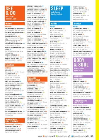 ALTIS AVENIDA HOTEL 7J Rua 1º de Dezembro, 120 Tel. 210 440 000 www.altishotels.com ALTIS GRAND HOTEL 3E Rua Castilho, 11 · T. 21 310 6000 www.altishotels.com ALTIS PRIME 3E Rua Rodrigo da Fonseca, 4 Tel. 210 456 000 www.altishotels.com BAIRRO ALTO HOTEL 3E Praça Luís de Camões, 2 Chiado · Tel. 21 340 8288 www.bairroaltohotel.com BROWN’S DOWNTOWN 7F Rua dos Sapateiros, 73 - Baixa Tel. 21 343 1391 CASA BALTHAZAR 5C Rua do Duque, 26 - Chiado Tel. 91 708 5568 www.casabalthazarlisbon.com CASA DAS JANELAS COM VISTA 7H Rua Nova do Loureiro, 35 Bairro Alto · Tel. 21 342 9110 HERITAGE AVENIDA LIBERDADE HOTEL 6H Avenida da Liberdade, 28 Tel. 21 340 4040 HOTEL BRITANIA 5F Rua Rodrigues Sampaio, 17 Tel. 21 315 5016 HOTEL DO CHIADO 6E Rua Nova do Almada, 114 Chiado · Tel. 21 325 6100 HOTEL RITZ FOUR SEASONS 1B Rua Rodrigo da Fonseca, 88 Tel. 21 381 1400 HOTEL TIVOLI LISBOA 4E Avenida da Liberdade, 185 Tel. 21 319 8900 www.tivolihotels.com INSPIRA SANTA MARTA HOTEL 6E Rua de Santa Marta, 48 Tel. 210 440 900 INTERNACIONAL DESIGN HOTEL 7C Rua da Betesga, 3 - Baixa Tel. 21 324 0990 LISBOA CARMO HOTEL 5D Rua Oliveira ao Carmo, 1-3 Chiado · Tel. 21 326 4710 LX BOUTIQUE HOTEL 3H Rua do Alecrim, 12 - Cais do Sodré · Tel. 21 347 4394 PORTO BAY LIBERDADE 4E Rua Rosa Araújo, 8 Liberdade · Tel. 210 015 700