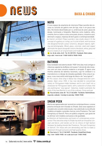 Alerta aos apaixonados por acessórios contemporâneos: a vossa próxima tentação tem morada no Chiado. Esta nova sapataria é inovadora do conceito à decoração, mas sobretudo na escolha de modelos arrojados e grandes marcas como Freelance, The Last Conspiracy ou Gienchi. Para um público exigente, que gosta de se afirmar com modelos exclusivos e de qualidade. 3 Attention all fashionistas and lovers of contemporary accessories! This new shoe shop in Chiado has both an innovative concept and decor, and stands out for its choice of high fashion footwear by leading brands like Freelance, The Last Conspiracy or Gienchi. For those who are demanding and like to make a statement through exclusive and high quality shoes. 5F Rua Ivens, 8 · Tel. 21 342 0499 · Facebook: SneakPeek.Chiado seg / mon 14h00-19h00 · ter a sáb tue to sat 11h00-19h00