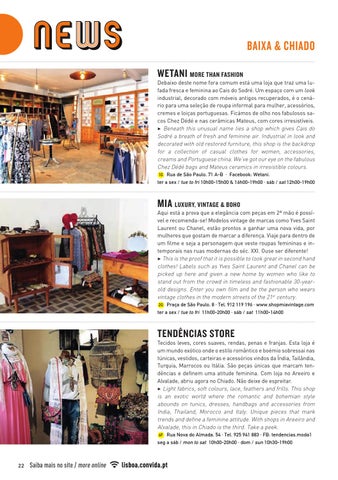 Tecidos leves, cores suaves, rendas, penas e franjas. Esta loja é um mundo exótico onde o estilo romântico e boémio sobressai nas túnicas, vestidos, carteiras e acessórios vindos da Índia, Tailândia, Turquia, Marrocos ou Itália. São peças únicas que marcam tendências e definem uma atitude feminina. Com loja no Areeiro e Alvalade, abriu agora no Chiado. Não deixe de espreitar. 3 Light fabrics, soft colours, lace, feathers and frills. This shop is an exotic world where the romantic and bohemian style abounds on tunics, dresses, handbags and accessories from India, Thailand, Morocco and Italy. Unique pieces that mark trends and define a feminine attitude. With shops in Areeiro and Alvalade, this in Chiado is the third. Take a peek. 6F Rua Nova do Almada, 54 · Tel. 925 941 883 · FB: tendencias.moda1 seg a sáb / mon to sat 10h00-20h00 · dom / sun 10h30-19h00