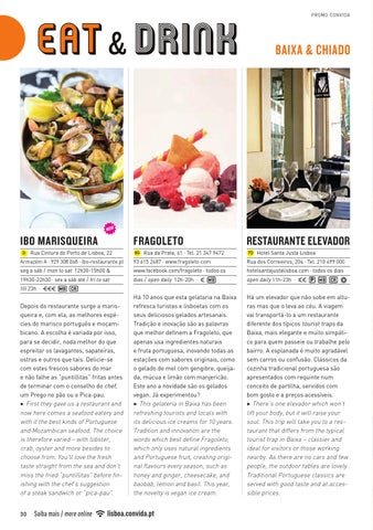 Há um elevador que não sobe em alturas mas que o leva ao céu. A viagem vai transportá-lo a um restaurante diferente dos típicos tourist traps da Baixa, mais elegante e muito simpático para quem passeie ou trabalhe pelo bairro. A esplanada é muito agradável sem carros ou confusão. Clássicos da cozinha tradicional portuguesa são apresentados com requinte num conceito de partilha, servidos com bom gosto e a preços acessíveis. 3 There’s one elevador which won’t lift your body, but it will raise your soul. This trip will take you to a restaurant that differs from the typical tourist trap in Baixa – classier and ideal for visitors or those working nearby. As there are no cars and few people, the outdoor tables are lovely. Traditional Portuguese classics are served with good taste and at accessible prices.