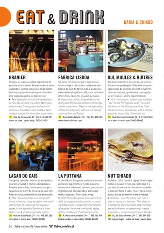 Nutella… Só o nome é capaz de estragar dietas e causar emoções. Esta loja é o paraíso do creme de chocolate e avelãs e está em todo o lado: nos crepes, croissants, bolas de berlim e até kebbabs. 3 Nutella… just the name can ruin a diet or cause excitement. This shop is a temple to the chocolate and hazelnut spread which is in everything: crepes, croissants, doughnuts end even kebabs. 6D Cç. do Sacramento, 20 · T. 211 399 070 FB: nut.portugal · todos os dias / open daily
