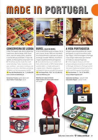 CONSERVEIRA DE LISBOA BUREL LOJA DA BUREL O Mar Português cabe dentro desta loja tradicional, aberta desde 1930. Prove atum, ovas de cavala, polvo, sardinha e outras delícias enlatadas. A loja é de apetite, as filas à porta comprovam-no! 3 The whole sea fits inside this traditional old shop. Tuna, mackerel, octopus, sardines – you name it and you can find it in a tin here. And there are plenty of takers, as the long queues testify! 9G Rua dos Bacalhoeiros, 34 · T. 218 864 009 www.conserveiradelisboa.pt