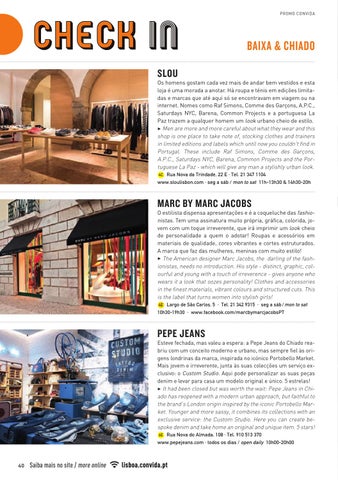 Esteve fechada, mas valeu a espera: a Pepe Jeans do Chiado reabriu com um conceito moderno e urbano, mas sempre fiel às origens londrinas da marca, inspirada no icónico Portobello Market. Mais jovem e irreverente, junta às suas colecções um serviço exclusivo: o Custom Studio. Aqui pode personalizar as suas peças denim e levar para casa um modelo original e único. 5 estrelas! 3 It had been closed but was worth the wait: Pepe Jeans in Chiado has reopened with a modern urban approach, but faithful to the brand’s London origin inspired by the iconic Portobello Market. Younger and more sassy, it combines its collections with an exclusive service: the Custom Studio. Here you can create bespoke denim and take home an original and unique item. 5 stars! 6E Rua Nova do Almada, 108 · Tel. 910 513 370 www.pepejeans.com · todos os dias / open daily 10h00-20h00