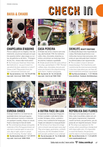 É a Beauty Boutique mais requisitada de Lisboa. Recheada de perfumes e cosmética das marcas mais exclusivas, tem ainda um spa onde pode fazer tratamentos diferenciados e sair rejuvenescido. 3 This is Lisbon’s most in-demand beauty boutique. Full of perfumes and cosmetics by the most exclusive brands, it also has a spa where you can have different treatments and leave rejuvenated. 4E Rua Paiva de Andrade, 4 · T. 211 930 236 www.skinlife.pt · Facebook: Skinlifeboutique