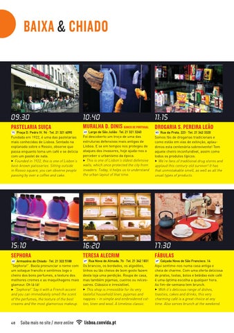 Rua Nova do Almada, 76 · Tel. 21 342 1831 Os brancos, os bordados, os algodões, linhos ou lãs cheios de bom gosto fazem desta loja uma perdição. Roupa de casa, mas também pijamas, cueiros ou nécessaires. Clássico e irresistível. 3 This shop is irresistible for its very tasteful household linen, pyjamas and nappies – in simple and embroidered cotton, linen and wool. A timeless classic.