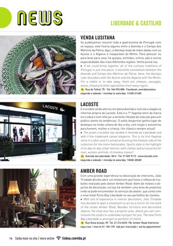 O crocodilo verde aterrou em plena Avenida e com ele a elegância informal própria da Lacoste. Esta é a 1ª flagship store da marca em Lisboa e vem reforçar a vertente lifestyle da colecção para um público atento às tendências. O estilo desportivo ganha lugar de destaque na moda urbana do dia-a-dia, com roupa e acessórios para homem, mulher e criança. Um clássico sempre actual! 3 The green crocodile has landed in Avenida da Liberdade and with it the trademark casual elegance. This is its first flagship store in Lisbon and it’s aimed at boosting the lifestyle side of the collection for the more fashionable. Sports style is the highlight of its day-to-day urban fashion, with clothes and accessories for men, women and kids. A timeless classic! 6H Avenida da Liberdade, 38 H · Tel. 91 549 9115 · www.lacoste.com segunda a sábado / monday to saturday 10h00-20h00