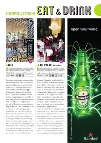 Fomos ao novo restaurante sensação da Avenida e levou nota 10! Gostámos da decoração ecléctica e sofisticada que cruza as madeiras e o mosaico com grandes telas de Caravaggio e Velásquez, alusivas ao convívio à mesa. E gostámos ainda mais do talento e simpatia do jovem chef Manel Lino, exímio na confecção de alta cozinha, numa fusão de modernidade e tradição. E por fim, gostámos do refrescante Pisco Sour. Queremos voltar. 3 This new restaurant gets top marks! We like the eclectic and sophisticated decor that mixes wood and mosaics with huge canvases by Caravaggio and Velásquez alluding to the art of dining in company. And we like the talent of the affable young chef Manel Lino even more, an expert in preparing haute cuisine, fusing modernity with tradition. And, finally, we love the refreshing Pisco Sour.