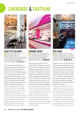 Mais do que um pronto-a-comer, o Hanami Sushi é daqueles spots que poderia estar em todos os bairros de Lisboa que nós agradecíamos. Sushi de fusão e sashimi confeccionados na hora marcam a diferença na apresentação e no sabor. Há menus variados, do mais tradicional ao mais inovador. E até o chá de frutos vermelhos, verde ou de ervas é feito no momento. Um conceito de comida rápida a preços acessíveis, com frescura e qualidade. 3 More than fast food, Hanami Sushi is one of those places we’d be happy to see in every part of Lisbon. In presentation and flavour, freshly prepared fusion sushi and sashimi can’t be beaten. There’s a variety of menus that range from the more traditional to the more unusual. And even the tea is made as you wait. A reasonably priced fast-food concept that’s fresh and good quality.