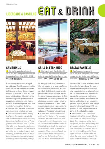 Com mais de 30 anos, este restaurante é um clássico que não sai de moda e onde é sempre um prazer voltar. No charmoso jardim ou na sala acolhedora, são servidas receitas tradicionais da cozinha portuguesa muitíssimo bem confeccionadas. Desfrute de um óptimo ambiente e de um serviço impecável. Seja ao jantar ou num almoço ao ar livre (menu almoço a E20), surpreenda os seus amigos neste oásis perto da Avenida da Liberdade. 3 Restaurante 33 is a classic that has been riding high for over 30 years and where it is always a treat to go back. Cosy inside and with a charming garden, the food is supremely well prepared traditional Portuguese fare. The atmosphere is excellent and the service impeccable, whether for an open-air lunch or dinner under the stars. Surprise your friends with this oasis next to Avenida da Liberdade.