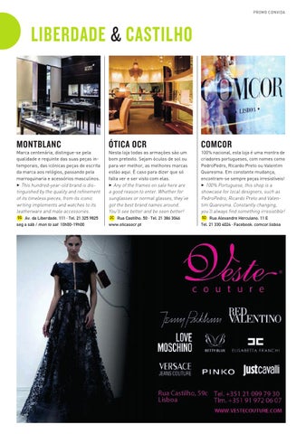 Nesta loja todas as armações são um bom pretexto. Sejam óculos de sol ou para ver melhor, as melhores marcas estão aqui. É caso para dizer que só falta ver e ser visto com elas. 3 Any of the frames on sale here are a good reason to enter. Whether for sunglasses or normal glasses, they’ve got the best brand names around. You’ll see better and be seen better! 2C Rua Castilho, 50 · Tel. 21 386 3046 www.oticasocr.pt