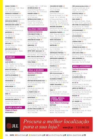 JOALHARIA DO CARMO 6D Rua do Carmo, 87 B - Chiado Tel. 21 342 3050 LEITÃO & IRMÃO www.leitao-irmao.com • Largo do Chiado, 16-17 4E Chiado · Tel. 21 325 7870 • Travessa da Espera, 14 9i Bairro Alto · Tel. 21 342 4107 • Hotel Ritz - Rua Rodrigo da Fonseca, 88 1B · T. 91 350 3384 MACHADO JOALHEIRO 5F Avenida da Liberdade, 180 Tivoli Fórum · Tel. 211 543 940 MARGARIDA PIMENTEL 6H CCB - Praça do Império - loja 2 Belém · Tel. 213 660 034 mpbymp@gmail.com MARIA JOÃO BAHIA 6G Avenida da Liberdade, 102 Tel. 21 324 0018 MONTBLANC 5G Avenida da Liberdade, 111 Tel. 21 325 9825 www.montblanc.com OURIVESARIA PORTUGAL 7C Praça D. Pedro IV (Rossio), 122 Baixa · Tel. 21 346 9446 OURIVESARIA SARMENTO 6D Rua do Ouro, 251 - Baixa Tel. 21 342 6774 FB: Ourivesaria Sarmento PADARIA 24 9G Rua da Padaria, 24 - Baixa Tel. 21 887 7525 www.padaria24.com RPN ATELIER DE RELOJOARIA 7i Cç. do Combro, 7 - Bairro Alto Tel. 21 604 2701 · www.rpn.pt SALDANHA & PIMENTA 1B Hotel Ritz - Rua Rodrigo da Fonseca, 88 · Tel. 21 385 2190 TORRES JOALHEIROS 4D Av. da Liberdade, 225-225 A Tel. 210 015 280 TOUS 5E Rua Garrett, 50-52 - Chiado Tel. 21 346 0458 · www.tous.com