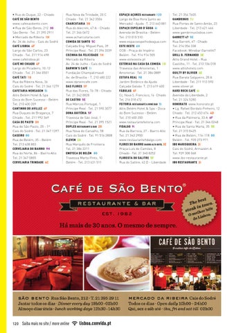• Rua do Duque, 22 - Chiado CAFÉ DE SÃO BENTO www.cafesaobento.com • Rua de São Bento, 212 3G São Bento · Tel. 21 395 2911 • Mercado da Ribeira 1H Av. 24 de Julho - Cais do Sodré CAFÉ LISBOA 4F Largo de São Carlos, 23 Chiado · Tel. 211 914 498 www.cafelisboa.pt CAFÉ NO CHIADO 4F Largo do Picadeiro, 10-12 Chiado · Tel. 21 346 0501 CAFÉ TATI 1G Rua da Ribeira Nova, 36 Cais do Sodré · Tel. 21 346 1279 CAFETARIA MENSAGEM 5i Altis Belém Hotel & Spa Doca do Bom Sucesso - Belém Tel. 210 400 209 CANTINHO DO AVILLEZ 4F Rua Duques de Bragança, 7 Chiado · Tel. 211 992 369 CASA DE PASTO 3H Rua de São Paulo, 20 - 1º Cais do Sodré · Tel. 21 347 1397 CASEIRO 8G Rua de Belém, 35 - Belém Tel. 213 638 803 CERVEJARIA DO BAIRRO 9H Rua do Norte, 86 - Bairro Alto Tel. 21 347 0805 CERVEJARIA TRINDADE 4C