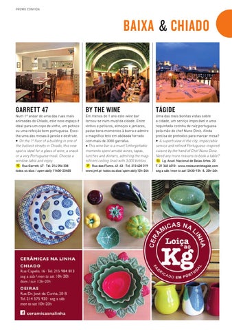Num 1º andar de uma das ruas mais animadas do Chiado, este novo espaço é ideal para um copo de vinho, um petisco ou uma refeição bem portuguesa. Escolha uma das mesas à janela e desfrute. 3 On the 1st floor of a building in one of the liveliest streets in Chiado, this new spot is ideal for a glass of wine, a snack or a very Portuguese meal. Choose a window table and enjoy. 5E Rua Garrett, 47 · Tel. 214 056 338 todos os dias / open daily 11h00-23h00